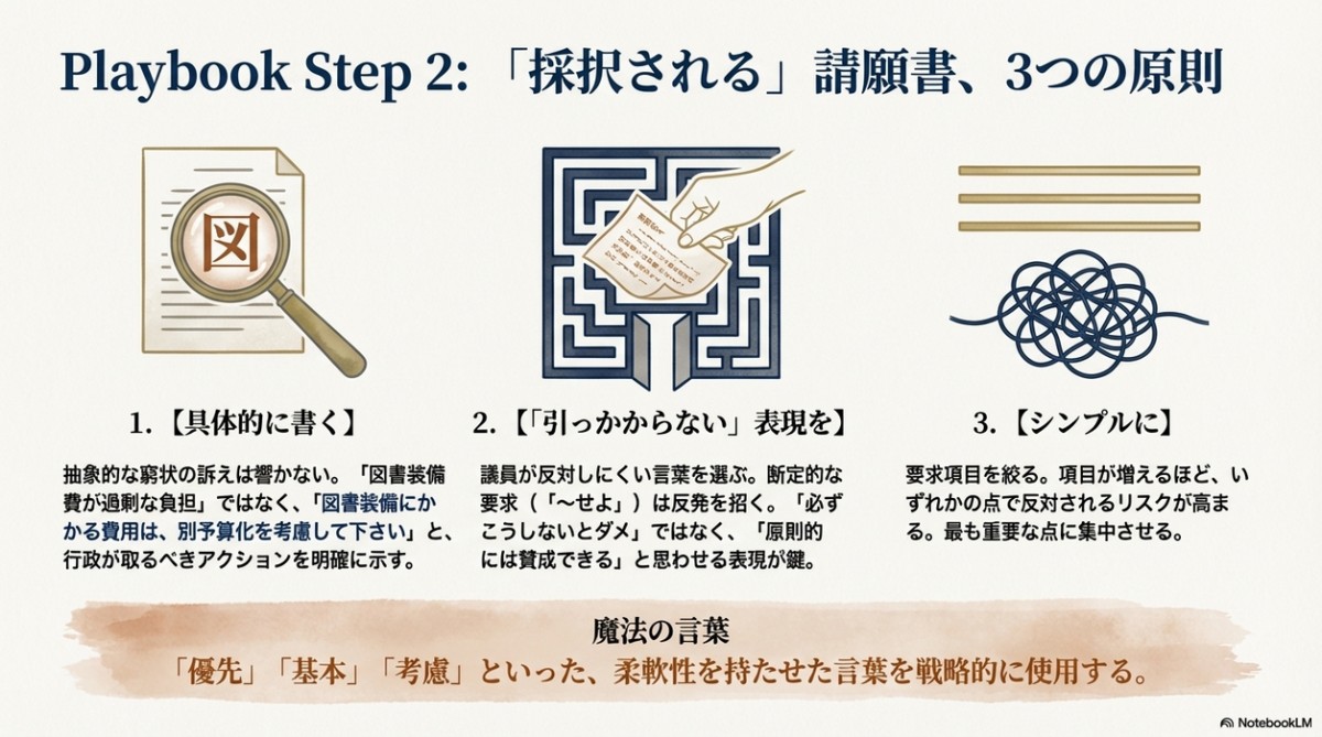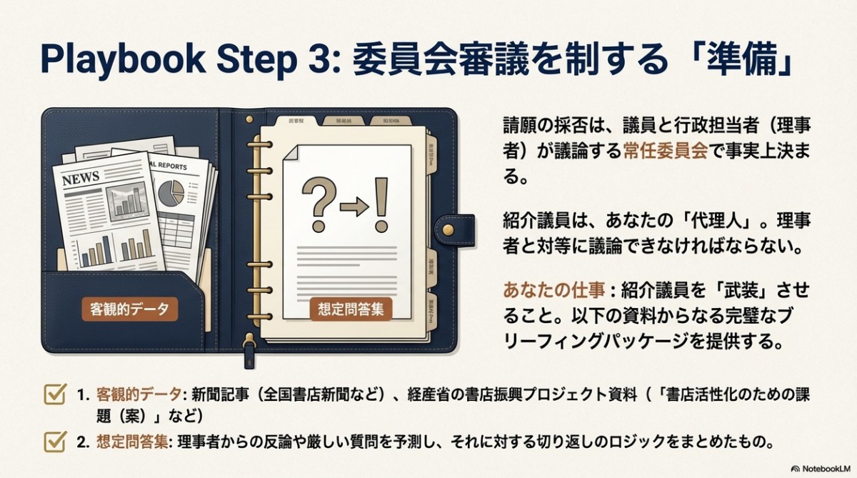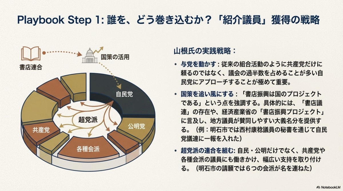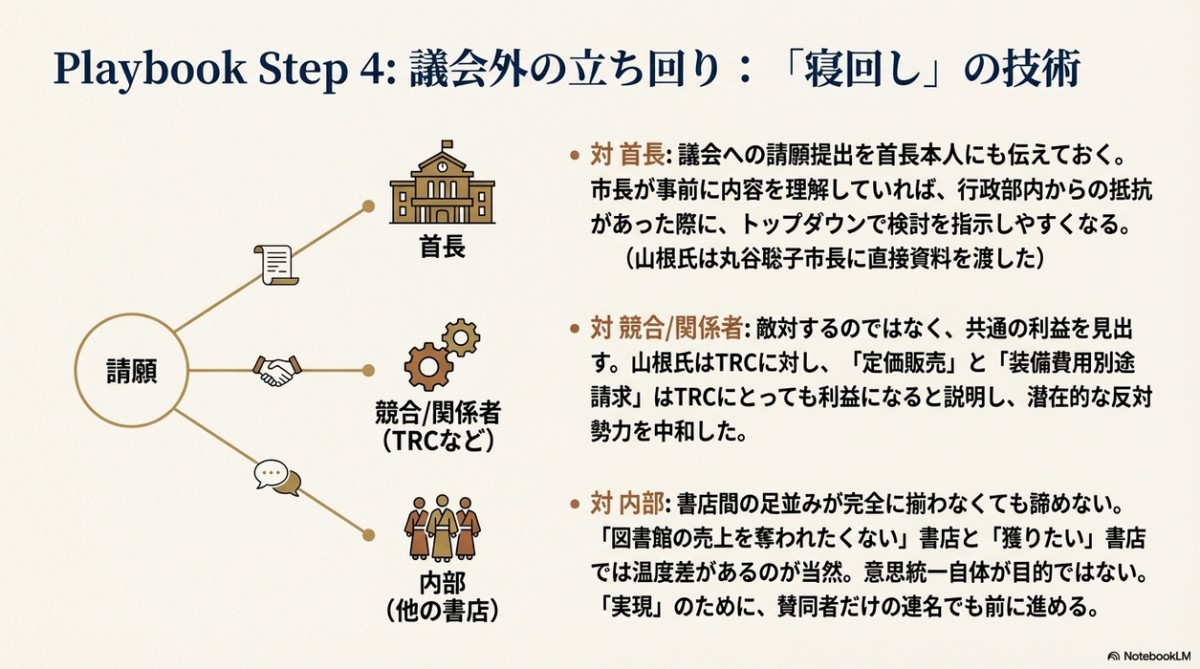 そして図書館納本に関する書店からの請願を全国でいち早く採択したのが明石市であり、その中心人物が、市議会議員を3期12年年勤めて行政や議会のロジックや手続きに精通していた書店主の山根氏だったのである。具体的なノウハウは以下。