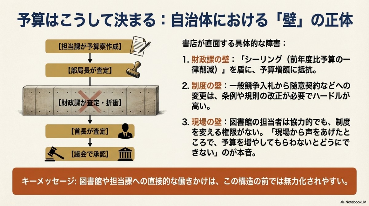 図書館はただでさえ予算が削られて資料が十分調達できないのに、定価購入&装備費を負担したら、買える本の冊数はますます減ってしまう。これではなかなか図書館現場から「書店のためにやりましょう」とも言いづらい。仮に「書店も大変だから」と定価にしようという予算案を組んでも、それを査定・折衝をする財政課に「ダメ」と言われたら差し戻されてしまう。