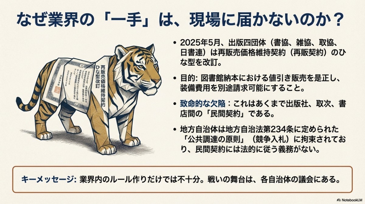 これに対して公取のお墨付きを得て、2025年春に再販契約書にあった「官公庁への入札の際は値引きOK」という条文が改訂された。つまり誰に対しても基本的に定価で売ってください、という内容に変わった。ところが再販契約は出版社―取次―書店間の契約にすぎない。