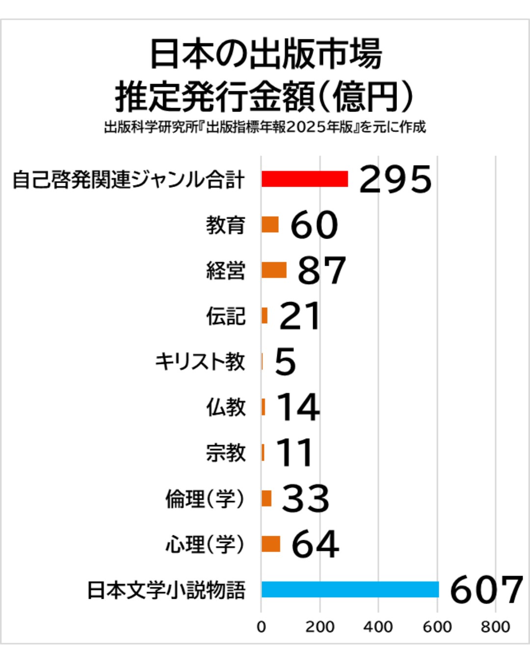 それに対して、自己啓発の本が含まれるであろうジャンルをすべて並べてみても、「心理(学)」63.85億円、「倫理(学)」33.31億円、「宗教」10.60億円、「仏教」13.91億円、「キリスト教」5.08億円、「伝記」21.38億円、「経営」86.64億円、「教育」60.20億円で合計294.97億円しかない。そして言うまでもなく、これらのジャンルの本のすべてが自己啓発書なわけではない。