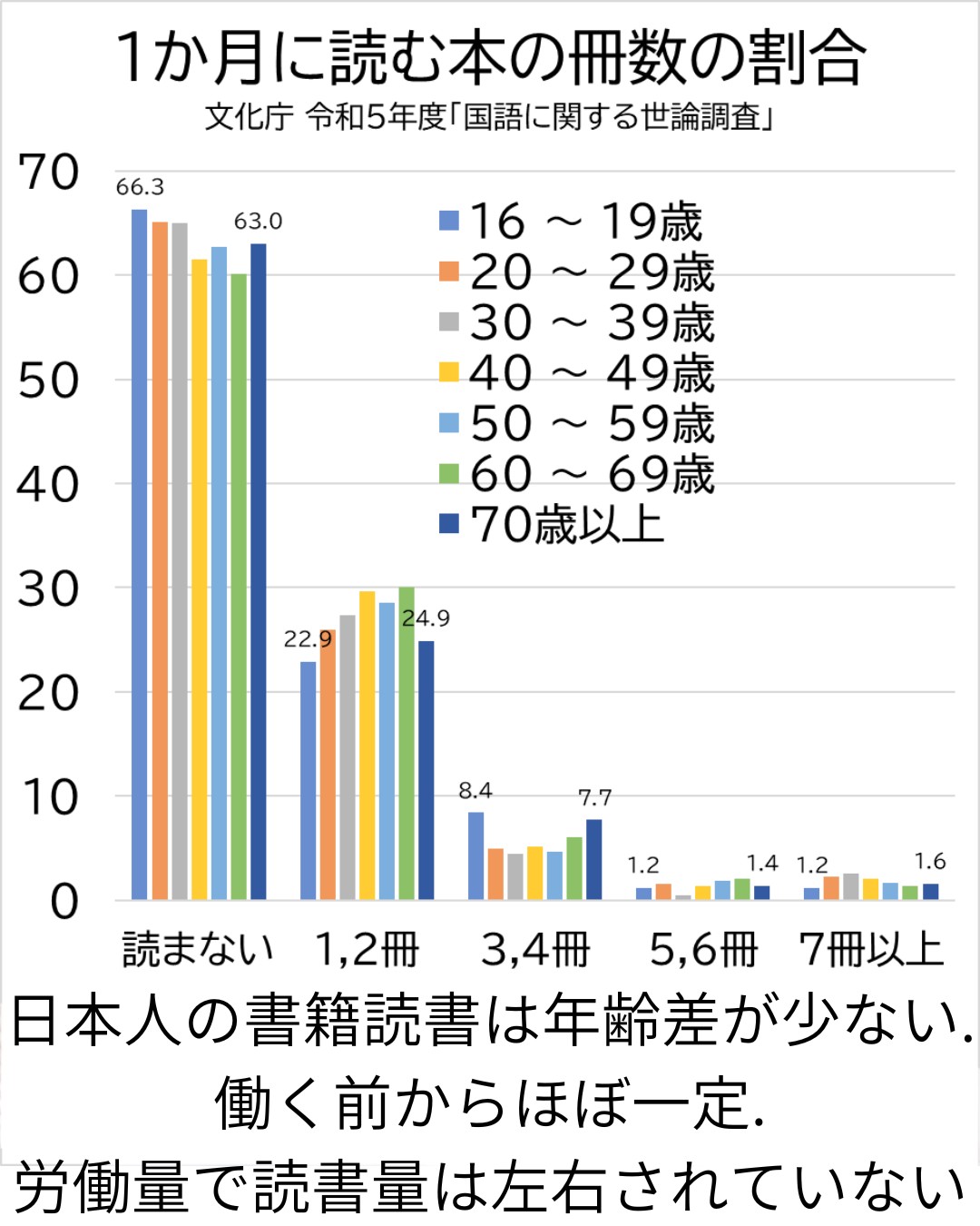 文化庁が「国語に関する世論調査」で5年に一度実施している読書調査で1か月に読む本の冊数の割合を見ても「読まない」「1、2冊」「3、4冊」「5、6冊」「7月以上」いずれも年齢による差は乏しい。