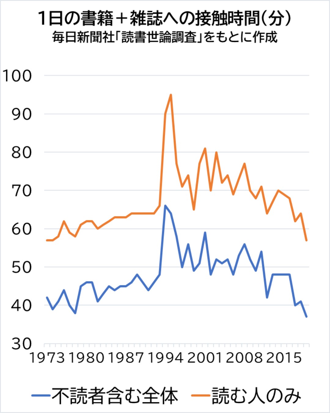 先ほどの読書世論調査のグラフを見てもらえばわかるが、書籍の読書率、読書量は、青年期以上の年齢では時代による変化に乏しいとみるべきだ。したがって「明治・大正の労働者や昭和のモーレツサラリーマンは長時間労働にもかかわらず本を読んでいたのに、なぜ最近は本が読まれないのか」という『なぜはた』の問いかけは、やはり前提から間違っている。戦後の出版流通システムができあがり、モノ不足(本の材料となる紙材不足)が解消された1950年代頃から、子どもを除く日本人の書籍の読書量や読書率にはほとんど変化がないからだ。