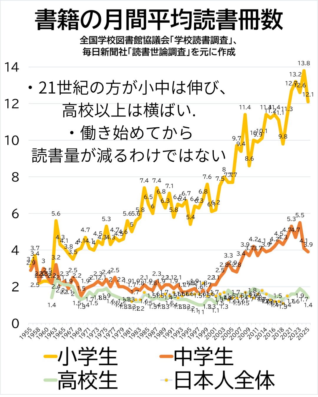 書籍の読書量は、全国学校図書館協議会「学校読書調査」によれば、2025年時点で小学生は平均月12.1冊、中学生は3.9冊、高校生は1.4冊。2019年まで実施されていた毎日新聞社「読書世論調査」では2019年時点で1.5冊。