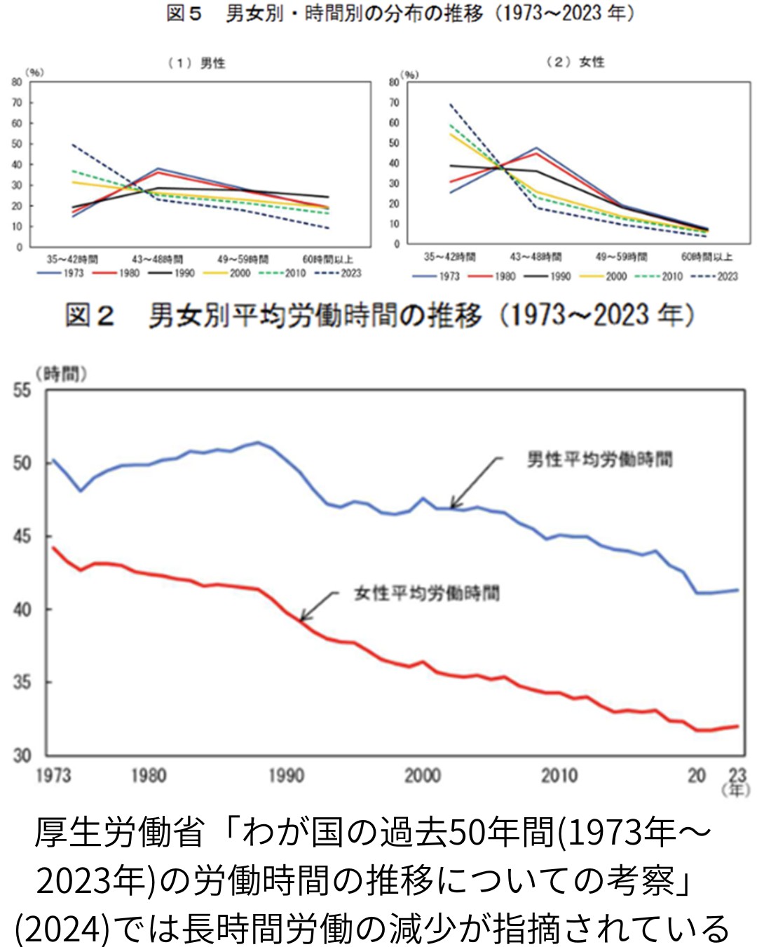 厚生労働省「わが国の過去50年間(1973年~2023年)の労働時間の推移についての考察」(2024年)では「男女を問わず、2000年以降は短時間労働者の割合が高まり、1週 60 時間以上働く長時間労働者の割合が低下している」「男性労働者については、長期的に見て1週 60 時間以上労働する者の割合が低下し、35~42 時間の層の割合が上昇している」と結論づけている。