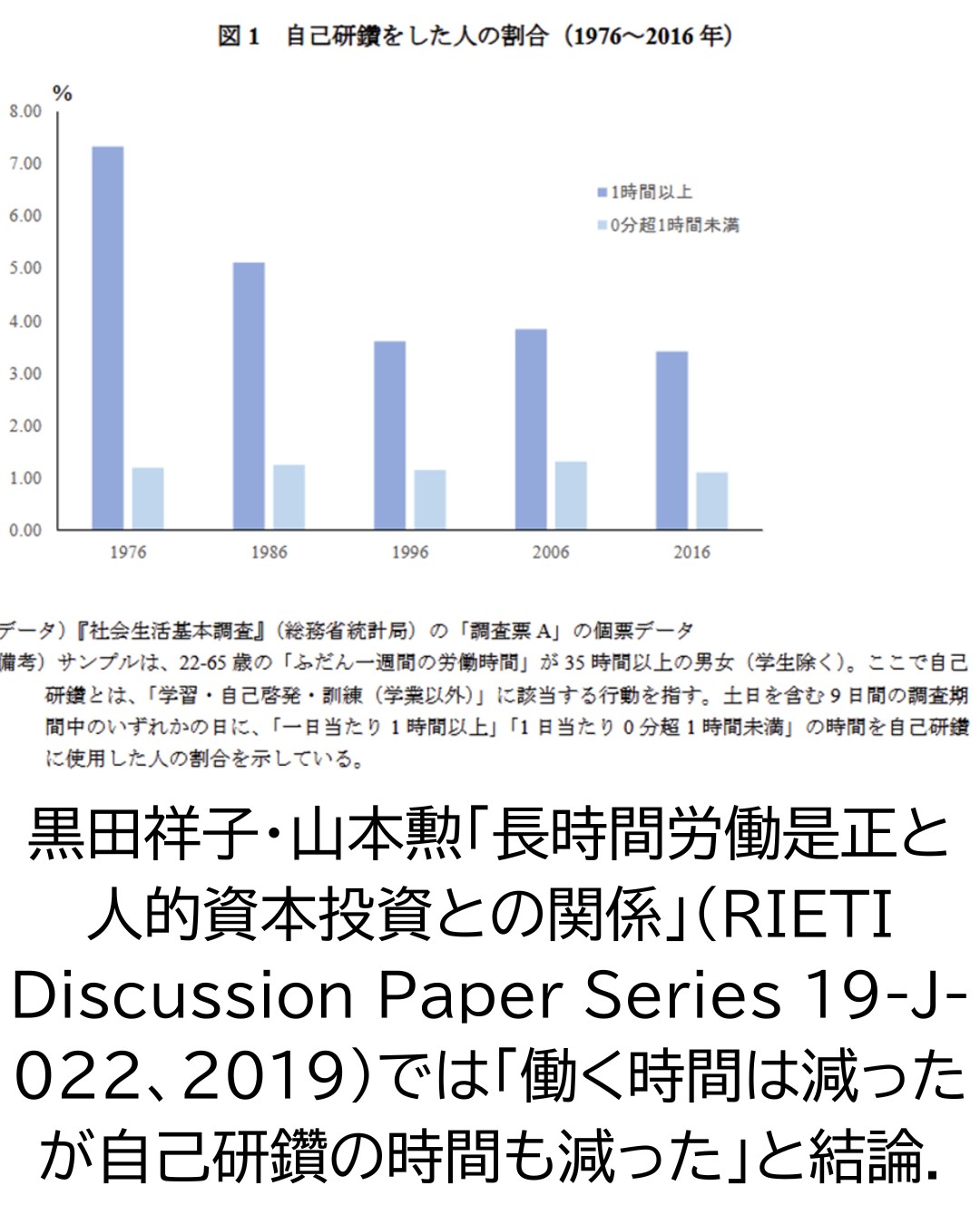 Discussion Paper Series 19-J-022、2019年)という、長時間労働が是正されたことによって自己研鑽の時間は増えたのか、減ったのかについて研究した論文がある(グラフは論文19pより引用)。