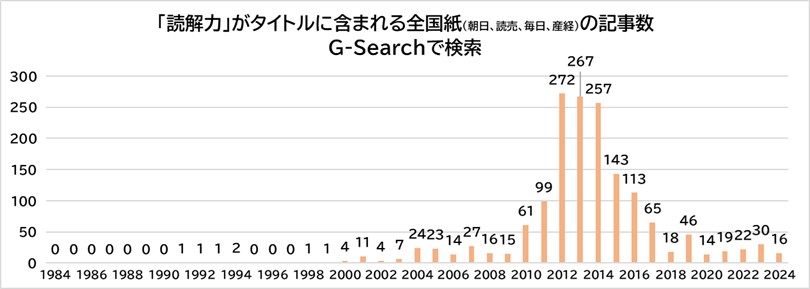「読解力」がタイトルに含まれる全国紙(朝日、読売、毎日、産経)の記事数を新聞・雑誌記事検索サービスG-Searchで調べると、1990年代まではほとんど0~2しかなく、2000年代に入ってから増え始め、2010年代初頭にピークを迎えていたことがわかる。