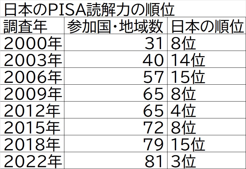 本記事で取り上げたいのは、2010代前半になぜここまで急増しているのか、という話だ。PISAの結果自体は2006年調査(2007年発表)で15位と底につけたあと2009年調査(2010年発表)、2012年調査(2013年発表)では順位は持ち直しているので、そこまで騒ぐ必要はないはずなのだ。